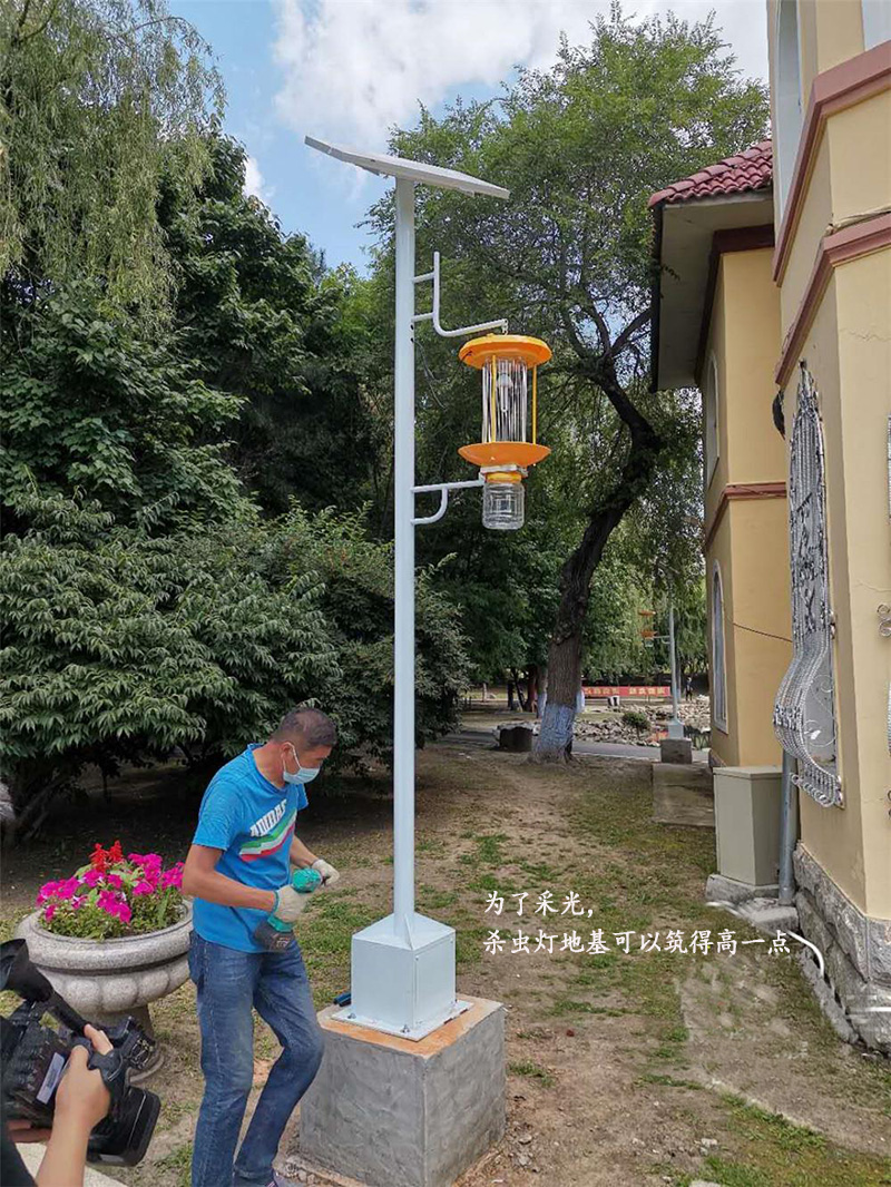 注:这个杀虫灯安装位置就不正确,太阳能板被遮挡,无法获取足够的光照,也就会充电不足。后续会出现杀虫灯晚上不亮或者亮灯时间短的故障问题。